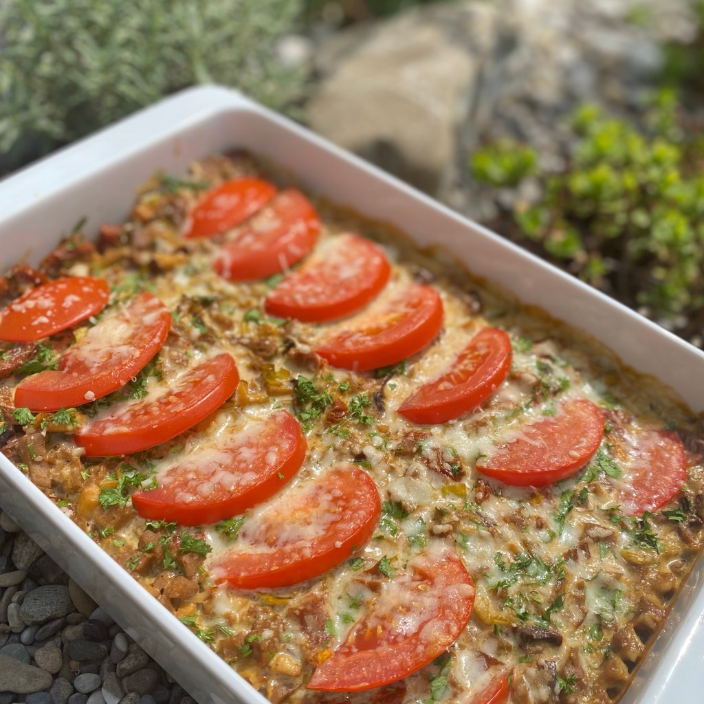 schmackhafte Alternative zu Fleisch. Lauch, Räuchertofu und Tomaten, cremig überbacken – ein vegetarischer Gratin voller Geschmack.