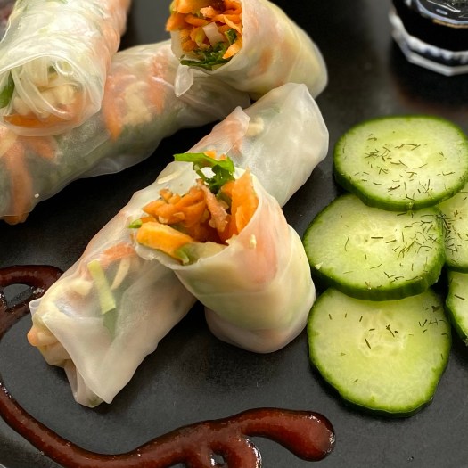 Lauch halbieren und in feine Streifen schneiden. Rüebli und Tofu an der Röstiraffel reiben. Avocado rüsten und halbieren und in Streifen schneiden. Schnittlauch mit der Schere in gewünschte Stücke schneiden. Die Reisteigblätter nach Anleitung (siehe Packung) vorbereiten und mit den verschiedenen Zutaten belegen. Mit Schnittlauch und Kräutersalz würzen und falten. Die Sommerrollen mit Sojasauce und Sweet and Souer Sauce servieren.