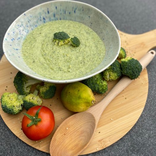 Brokkoli in Röschen teilen und in Gemüsebouillon weichkochen. Einen Teil der Bouillon auffangen. Den Rest der Bouillon mit dem Brokkoli und allen andern Zutaten mit einem Stabmixer cremig pürieren. Eventuell noch etwas von der aufgefangen Gemüsebouillon dazugeben. Mit Salz und Pfeffer abschmecken.